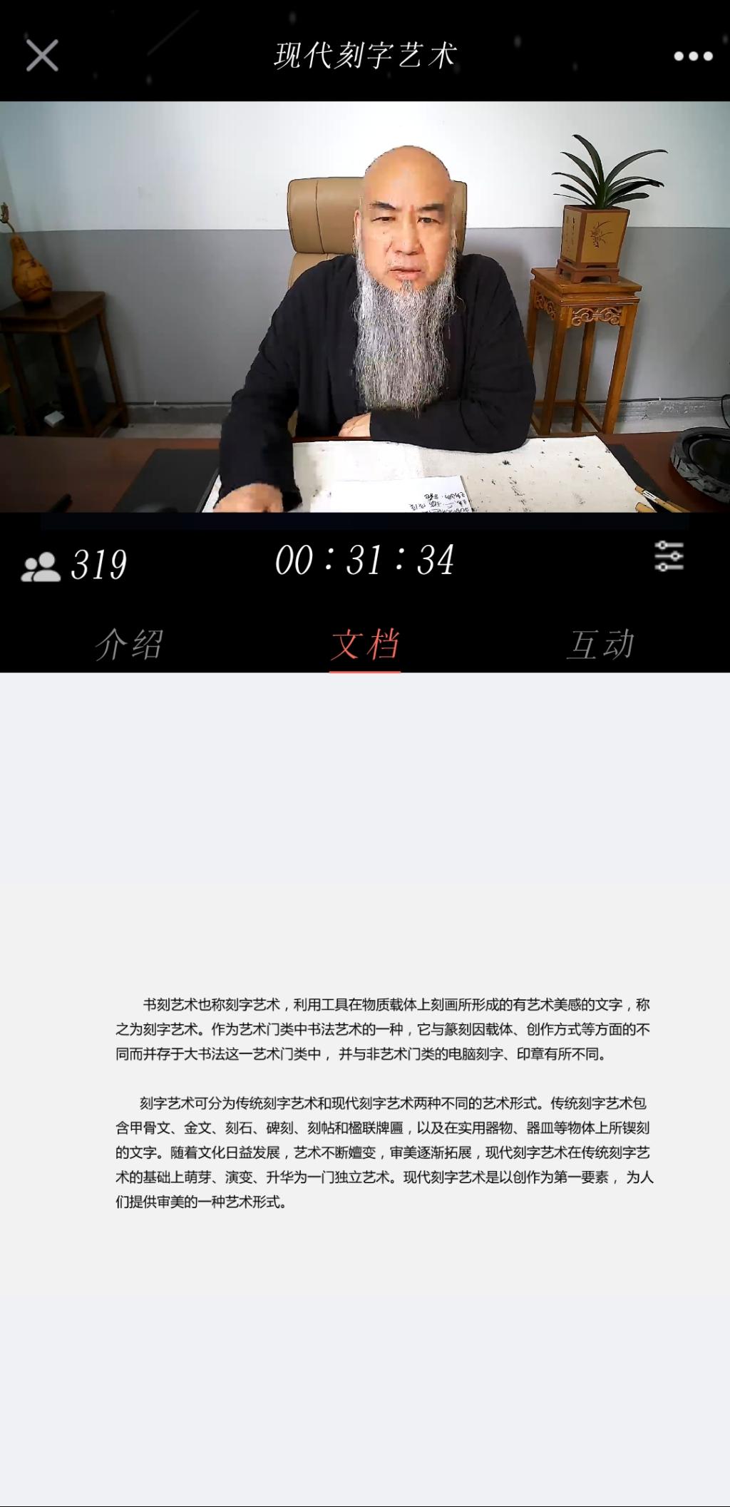 10月18号下午,学校客座教授、清修书刻艺术工作室导师冯清修在线上作了“现代刻字艺术”专题讲座,校内外师生及书法爱好者300余人参加,讲座由艺术学院院长王雪松主持。