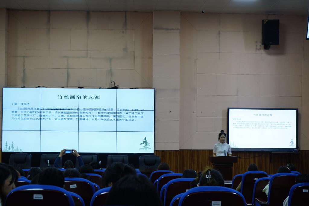 4月11日下午,艺术学院邀请武胜县竹丝画帘有限公司总经理、非遗文化传承人陈美勰在紫金厅开展"竹丝画帘创作”主题讲座,参与讲座的师生200人。