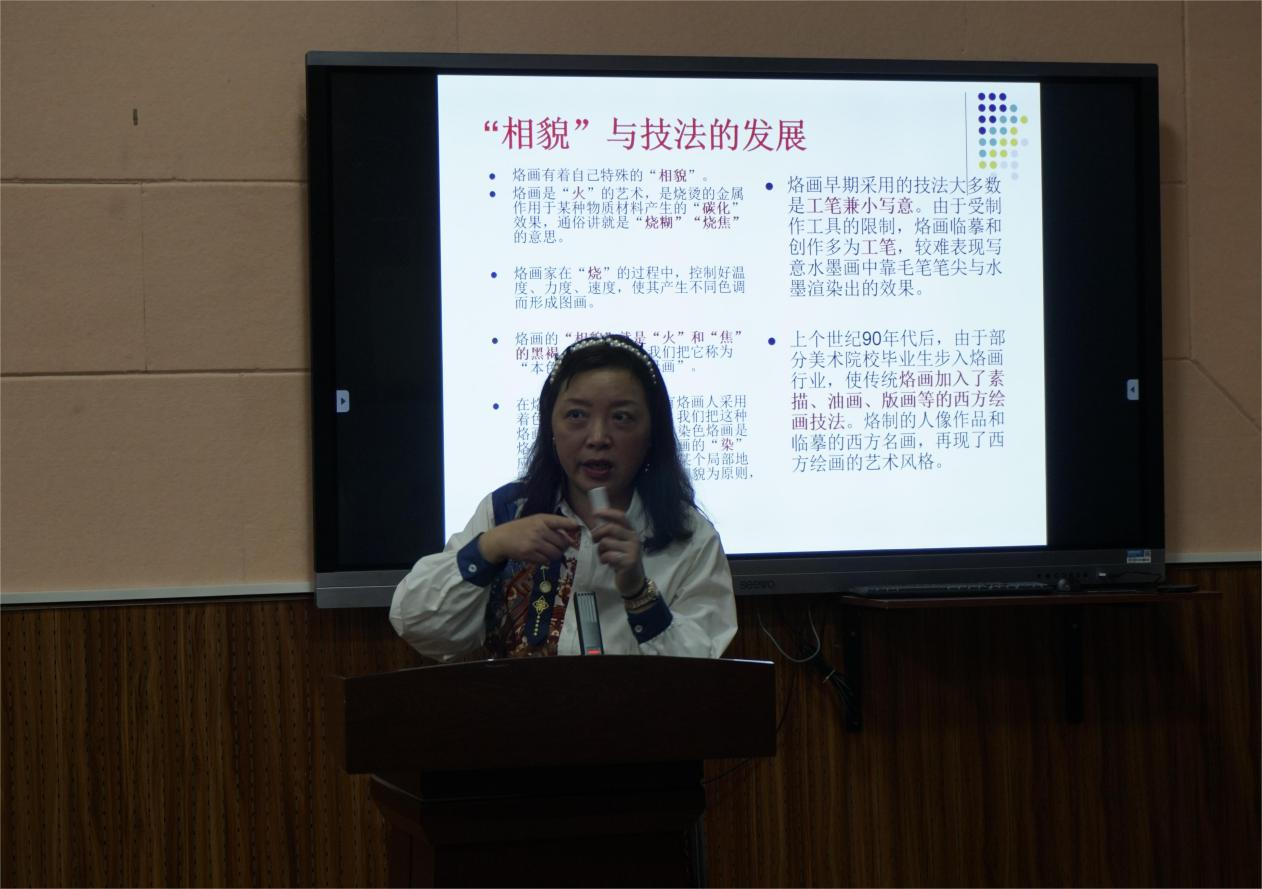 卢文利通过幽默风趣的语言让同学们在轻松愉悦的氛围中走近烙画艺术,她为大家详细介绍了烙画使用的材料、工具、步骤、技巧,尤其提到了创作时的安全注意事项。最后讲座在师生的热烈交流中圆满结束。