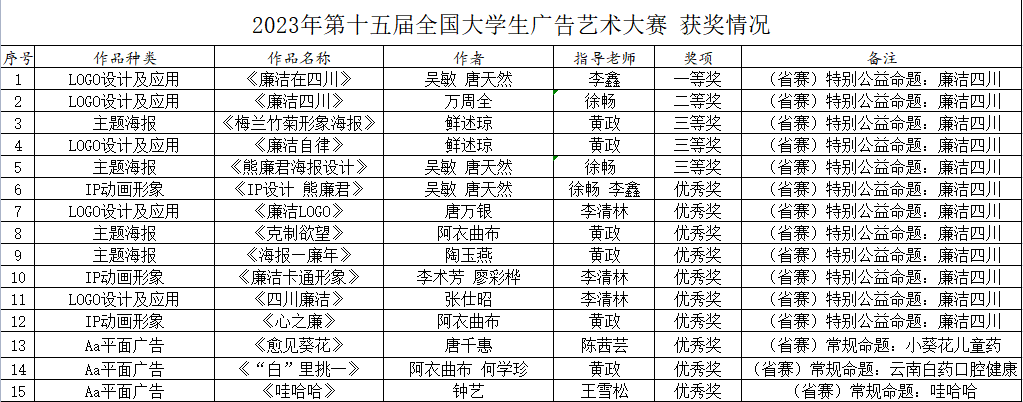 2023年7月26日,第十五届全国大学生广告艺术大赛(简称大广赛)全省总评审落下帷幕,我院选送的作品经过激烈的赛区评选,突出重围参评省赛。在全省总评审阶段,由王雪松、黄政、李清林、徐畅、陈茜芸、李鑫六位老师指导的作品,分别获得省级一等奖1项、二等奖1项、三等奖3项、优秀奖10项。荣获佳绩。