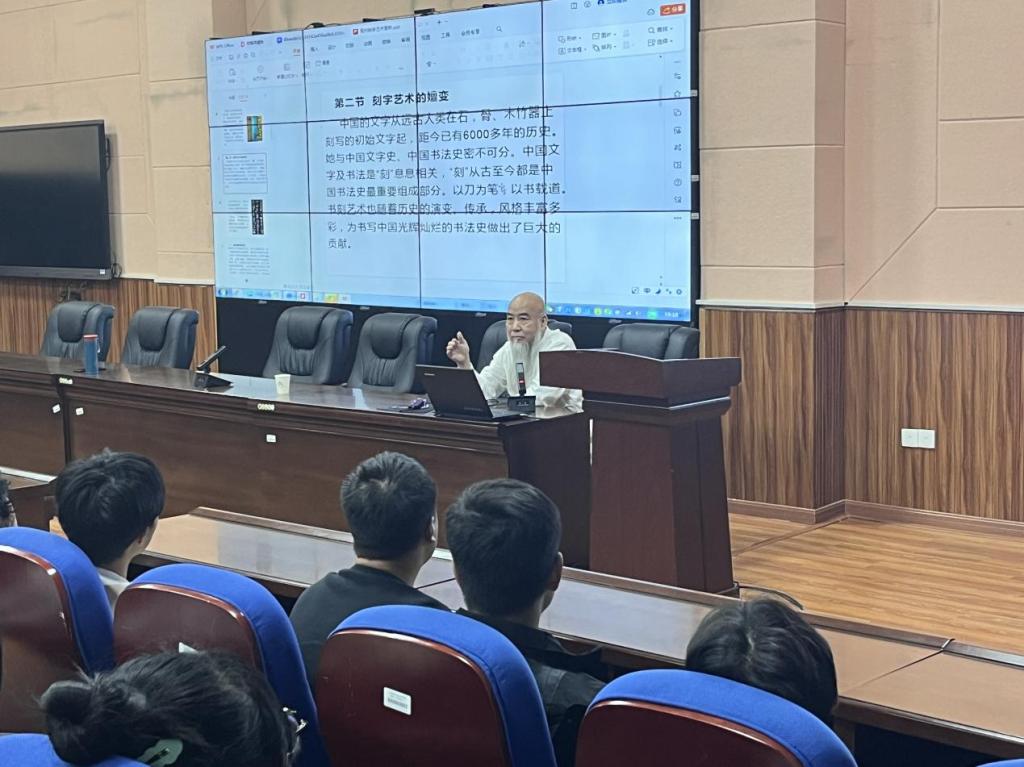整个讲座过程中,同学们认真听讲、积极互动,加深了对书刻艺术的专业知识的了解,特别是对书刻艺术创作流程有了理论和实践上的双重认知。冯清修老师从书刻艺术的起源及发展脉络、书刻工具的使用方法、书刻的创作技法三个角度,结合众多经典名家书刻作品,和同学们分享了书刻艺术的系统理论知识。