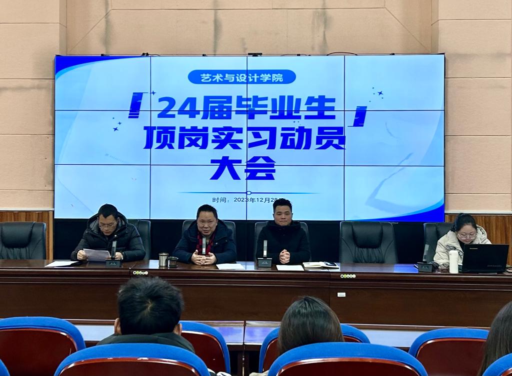 为了确保2021级学生明确顶岗实习的目的、意义,引导学生做好顶岗实习工作,艺术与设计学院于12月28日下午在致用楼紫金厅召开2021级顶岗实习动员大会,艺术与设计学院院长王雪松、副院长黄政、副书记杨小乐、教学科长田芮凡、学生科长刘瑶、教学秘书陈茜芸、21级全体学生及班导师参与了此次会议,会议由副院长黄政主持。