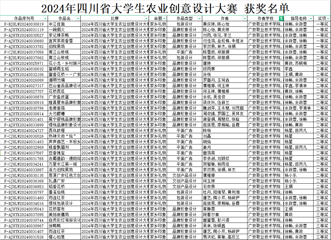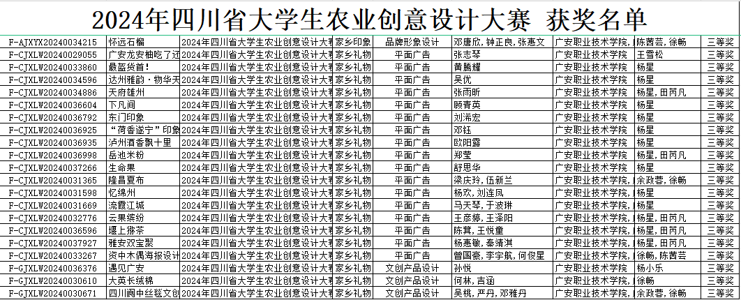 近日,2024年四川省大学生农业创意设计大赛落下帷幕,我院学生凭借出色的创意与专业技能在众多参赛者中脱颖而出。我院广告艺术设计专业、动漫制作技术专业学生积极备赛、踊跃参与,在此次大赛中载誉而归,共荣获一等奖6项、二等奖24项、三等奖30项。