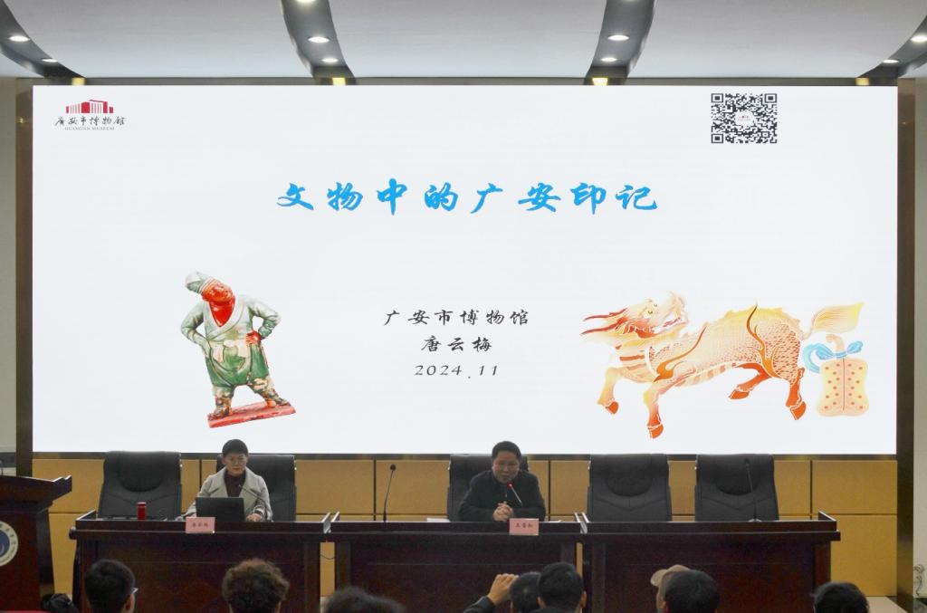 2024年11月26日下午,学院特邀广安市博物馆馆长唐云梅女士,在明德楼希贤厅开展“文物中的广安记忆”专题讲座,学院师生200余人参与,本次讲座由学院院长王雪松主持。