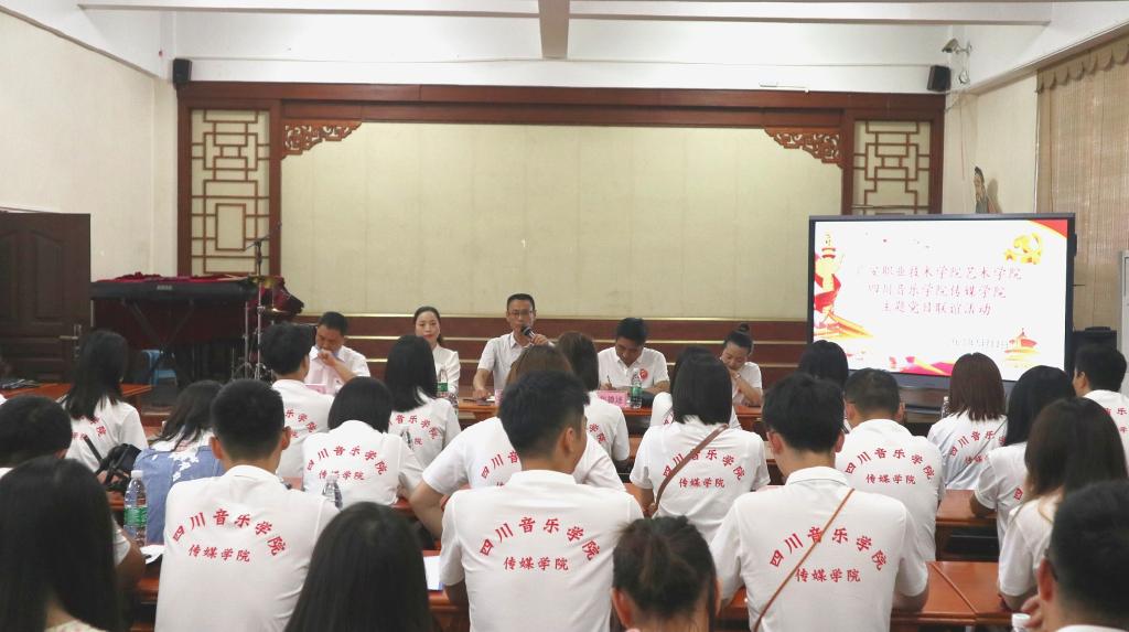 为深入贯彻党史学习教育,以多种形式庆祝建党100周年,缅怀小平同志,传承红色革命精神,加强高校间党建、教育教学等文化交流,2021年5月11日,广安职业技术学院艺术学院联谊四川音乐学院传媒学院在广安职业技术学院致用楼国学馆开展了“学党史.忆小平.传承革命精神”主题党日活动。广安职业技术学院党委委员、副校长袁祖洪,艺术学院院长杨小锋,四川音乐学院传媒学院党总支书记、院长包德述,四川音乐学院传媒学院党总副书记刘莉及两校部分党员老师和预备党员学生参加了活动,活动由艺术学院党总支书记杨书琴主持。