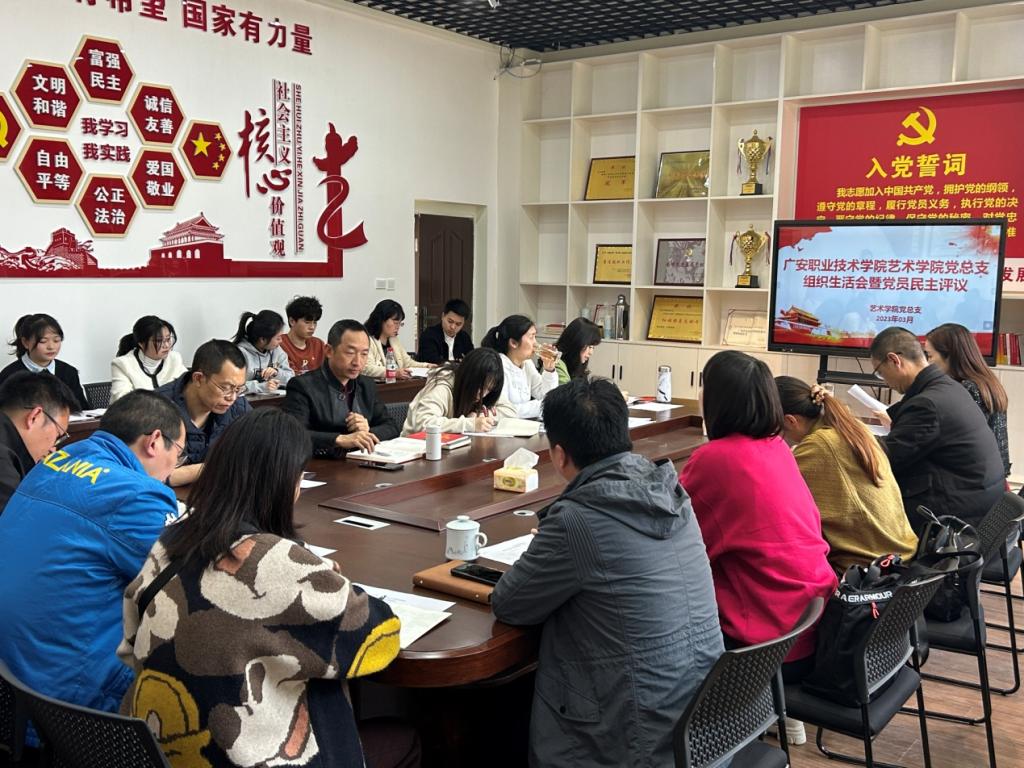 为深入学习贯彻党的二十大精神,不断推进党的建设,根据《中共广安职业技术学院委员会关于召开2022年度基层党组织组织生活会和民主评议党员的通知》的文件要求,艺术学院党总支组织全体党员于3月11下午,在致用楼201开展了“2022年组织生活会&民主评议党员”会议。学院联系领导学校党委委员、副校长袁祖洪参加了此次会议,民盟广安职业技术学院委员会主委、艺术学院院长王雪松列席本次会议。
