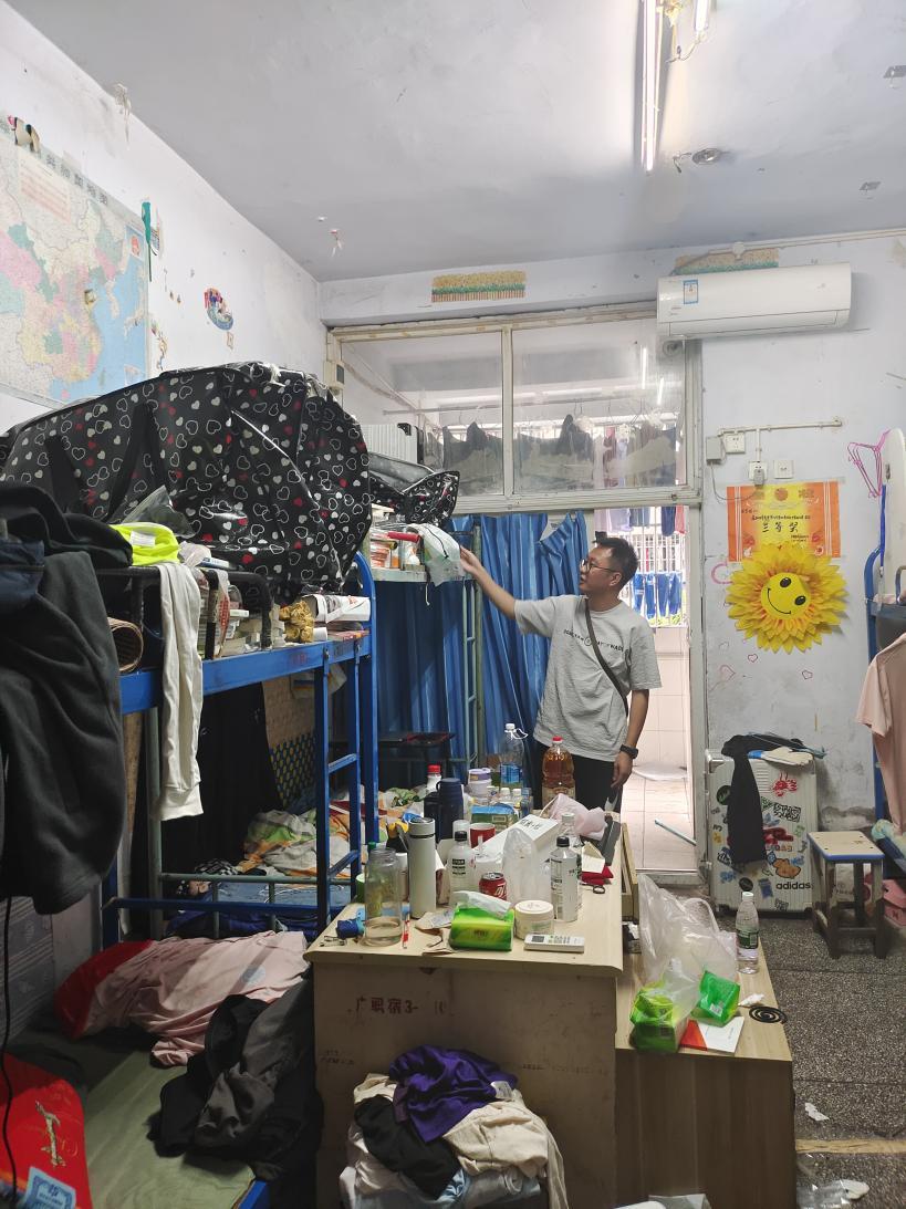 本次检查针对学生宿舍卫生环境、是否存在使用大功率电器、是否喂养宠物等安全隐患进行排查。在检查中发现大多数寝室环境干净整洁,不存在使用大功率电器的现象,无喂养宠物,如思贤楼210、115、116等寝室;但个别男生寝室存在桌面脏乱差,垃圾堆积,地面有烟头等现象,如思贤楼111,针对检查中发现的问题老师们严肃指出,并要求立即整改。