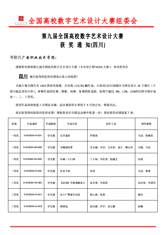 热烈祝贺我院师生在第九届全国高校数字艺术设计大赛(四川赛区)中斩获省级一等奖4项、二等奖9项、三等奖7项的喜人成绩。