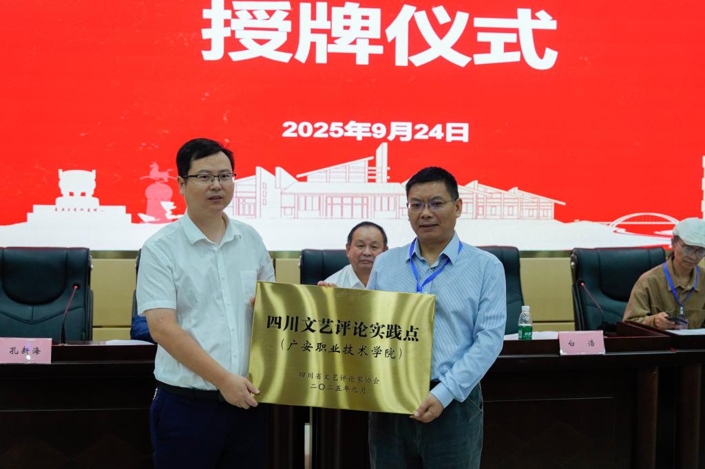 会上举行了授牌仪式,四川省文艺评论家协会秘书长白浩代表协会,向广安职业技术学院授予“四川文艺评论实践点”牌匾。这一实践点的设立,标志着我校在文艺评论领域的探索与实践获得了省级专业组织的认可,将为学校师生提供更高层次的学术平台,推动文艺评论与教育教学、红色文化研究深度融合,助力区域文艺生态建设。艺术与设计学院院长、广安市文艺评论家协会主席王雪松在会上作主题交流发言。