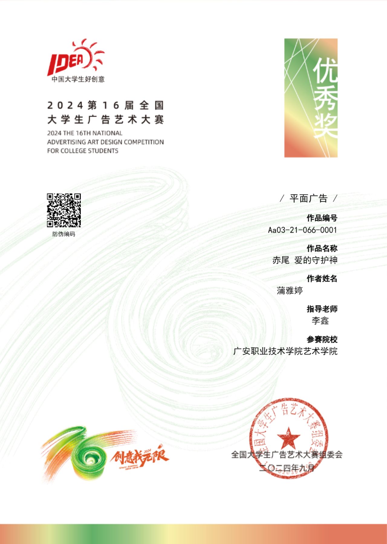学生获全国大学生广告艺术大赛省全国优秀奖